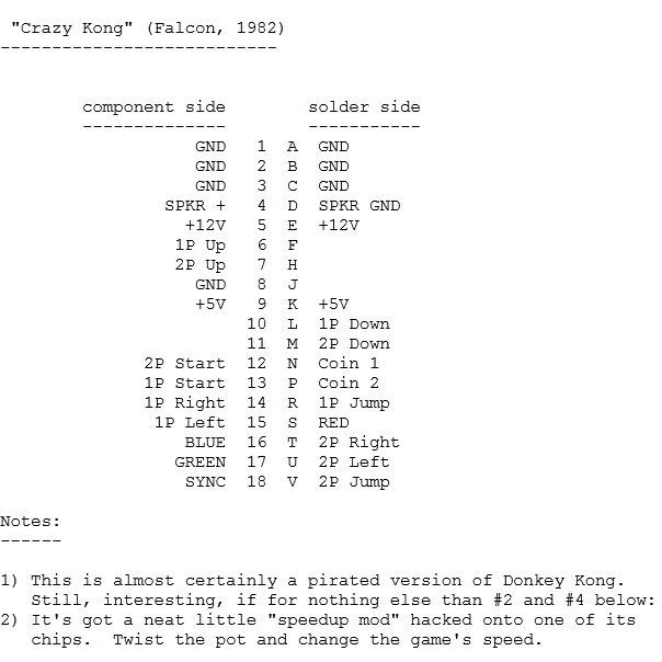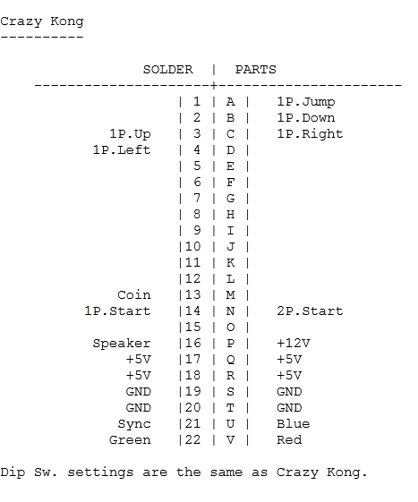PCB Pinouts Crazy Kong