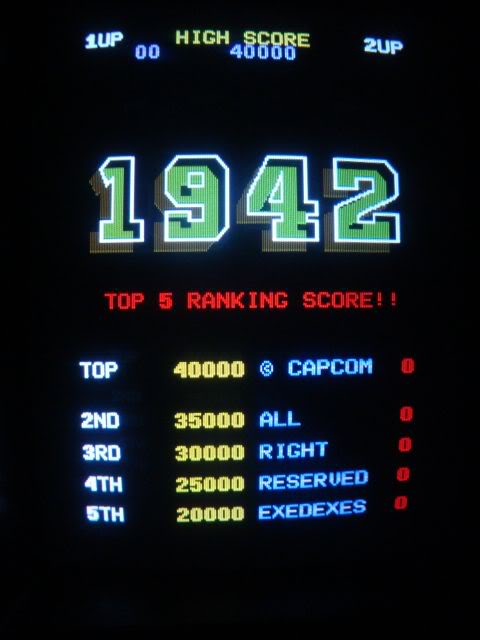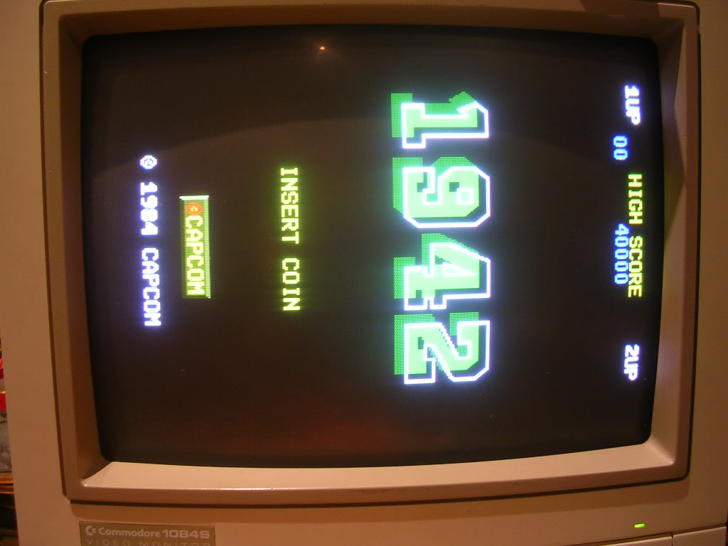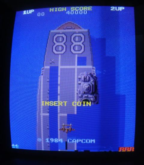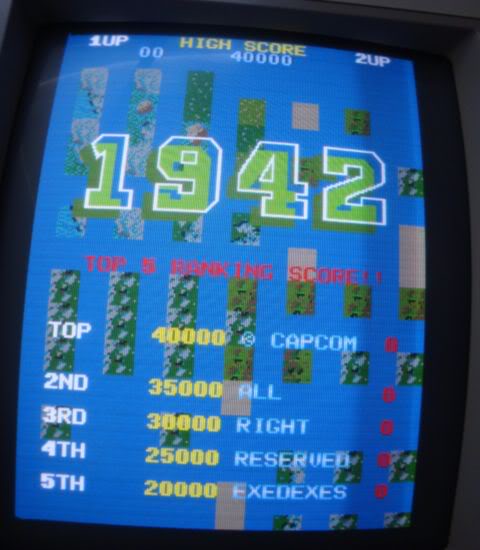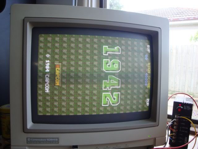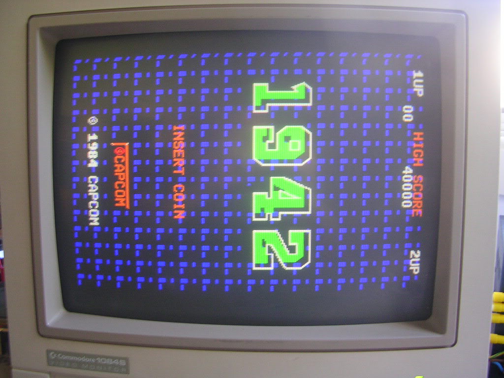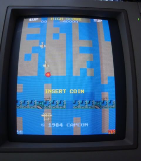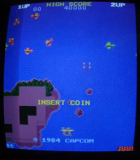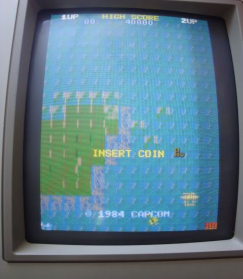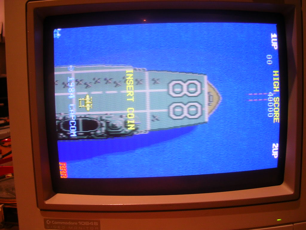The initial problem was that its was not JAMMA, nor was it Capcom classic pinout as it has a 22 pin edge connector so it wasn't the standard 1942 bootleg pinout, a quick check with the multimeter showed it also wasn't the 22 pin bootleg pinout. Right at the end of the fix when I was trying to infer the control pin layout did I actually find the 22 pin pinouts that made sense for this board. Initially I had to work it out myself, which actually is quite easy if you have an oscilloscope. The 5V and Ground rails are easy enough to work out as all the TTL chips connect back to this, and for initial troubleshooting of a board you only really need the 5V, the ground, and the video output, enough to power up the board and see what it does. On a running board with no 12V (so the amp is off) the only signals you should see coming out of the board are the 3 colour channels and video sync, the colours look like very weak noisy signals and the sync is a regular pulse. So wiring up the loom was quite easy, except which colour is which. MAME is damn handy to see what a game should look like, it literally was a case of going round with a loose wire touching each of the three outputs to see which made the sea blue during attract mode, the other two were a 50/50 guess and suddenly I had a full video output.