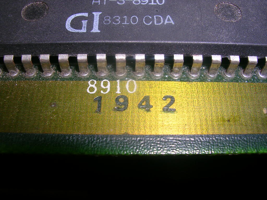 At this point I finally got round to dumping the ROM contents, none of the 3 ROMs by the 6116 were recognised, the main program EPROM (a 27c64) was not even seen by my tester, yet when it was told to blindly drive the chip gave a dump that was an exact match for the 1st ROM in the Capcom set. On the far side of the GFX board were 5 other 27c128 ROMS, 3 dumped fine and matched the capcom set, one had contents not recognised and one was totally dead - not detected and gave a dump full of FFs. The 3 chips that read fine still had their original stickers on them and were all Mistubishi chips, the remaining two had no stickers and were a TI and a Hitachi ROM - not original.