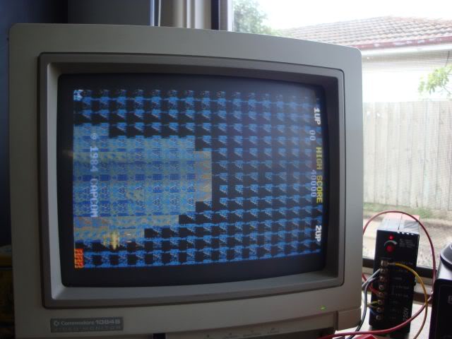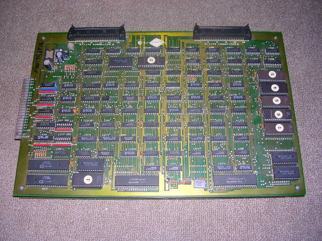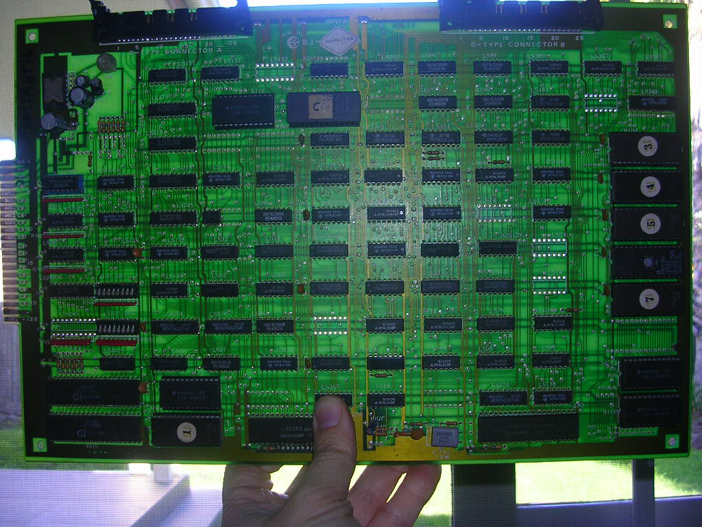 At this point I ended up going off on a trip through the logic trying to find where things went, sadly what I took as being suspicious turned out to be totally normal, so my 3 evening voyage was a bit pointless. Basically I was trying to find a non existent fault that was causing the normal operation of a clock pin to a pair of 74LS174s. For some reason on the 3rd evening the board decided to taunt me. At the same time the colours went nuts and the backdrop graphics appeared for about 30 seconds, long enough for me to hit my suspect chips with a scope and find that nothing much had changed from when the background was missing to when it was scrolling merrily along. Probably the biggest waste of time was tracing a track on the CPU board up to the edge connector, through to the gfx board edge connector and then losing it. None of the tracks coming out from the edge connector were connected to it, the track was on the parts side of the PCB so I couldn't eyeball it either as it was under the connector. I ended up removing the 50 way connector only to find the track really didn't go anywhere, it was just a pad, another joy of bootleg boards is that they often have errors or were not designed from scratch for the game they ended up running.