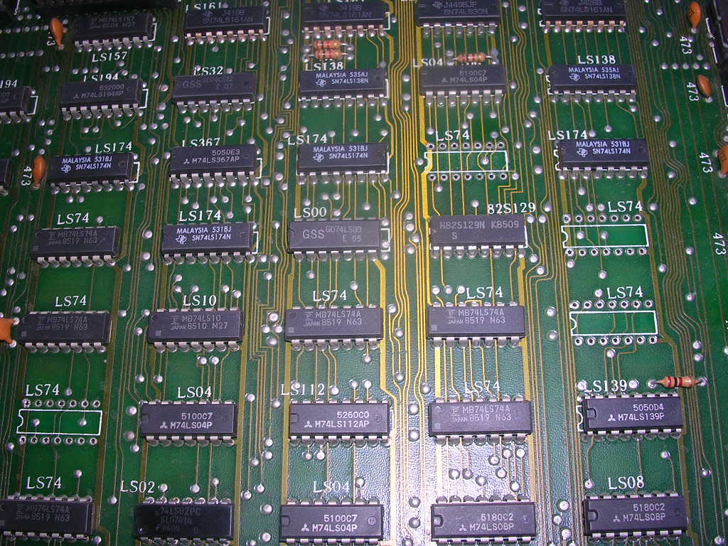 ...more life, just, but the board was still not actually running. A quick scoot round with the scope showed a few more Fujitsus with floating pins. It is common on PCBs with chips from a mix of manufacturers to find each maker supplied only a few chip types, and as I was focusing on the Fujitsus I only had to contend with 74LS74s, 74LS157s, 74ls283s, a single 74LS10, 74LS273s and 74LS245s. So I wheeled out my HP Logic Comparator.