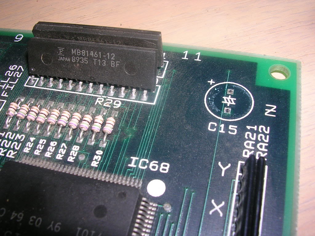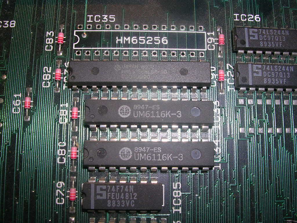 IC35 is a Hitachi HM65256 SRAM chip and it is well hidden under the ROM board, so poking a scope at it when the board is running involved having the board upside down and working on the pins from underneath, this didn't really show anything as all the signals looked perfectly healthy.