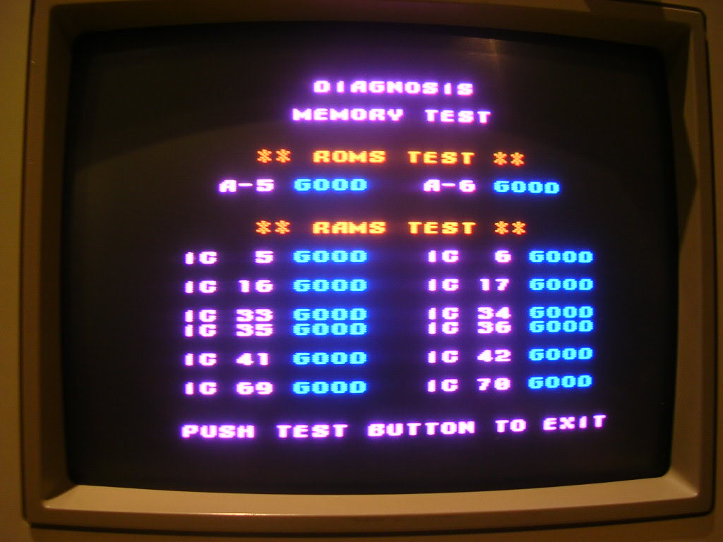 So I grabbed some wire and shorted the relevant pins on the JAMMA connector to get into the diagnostics menu, somewhat painful on this board as every test is a separate menu you have to hop through, not easy with a bit of wire, I really should wire up Service and Test buttons on this harness - one day perhaps.