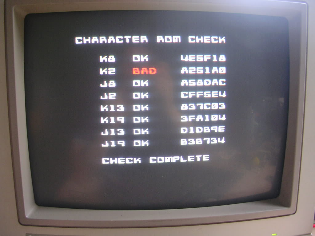 By far the most likely candidate was the mask ROMs, so I flipped switch 3 on Dip Bank 3 and put it into test mode. The test it performs on boot up is only a quick test of system RAM and ROM, it ignores the mask ROMs entirely. After a few minutes thinking about it the board came back with the report that K2 was bad.