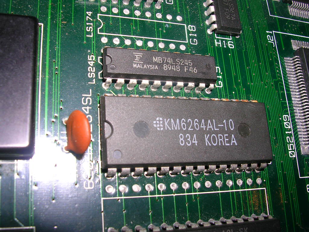 So moving on the data pins of the system SRAM, thats where things started to look bad, on 5 of the 8 pins everything looked healthy, but on three the logic levels were often very low, nowhere near the 4-5v difference they should be. In most cases you would suspect the SRAM chip itself but upstream of this was a Fujitsu 74LS245 chip acting as the bus transceiver.