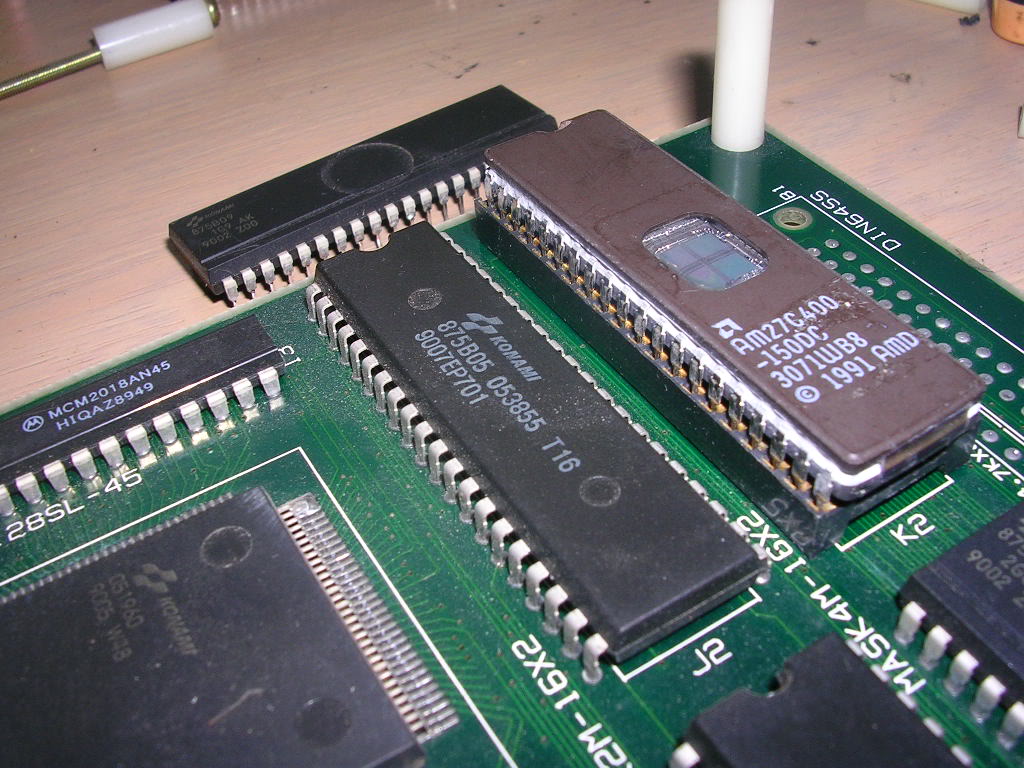 ...and as I know these are pin compatible with 27c400 eproms I tried to dump on my eprom reader, it reported that a number of pins were AWOL and the resulting dumped data was not recognisable. So in went a 40 pin socket and a 27c400 EPROM burnt with the data k02_b09.bin from the MAME set.