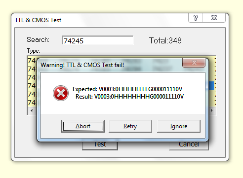 Even tho the DIR signal looked healthy and the B side of the chip seemed ok, the A side had the mangled signal on three of its pins. So it was either the 74LS245 or the SRAM. In this case the Fujitsu TTL was the more likely of the two, so I pulled it and tested in in my EPROM reader...