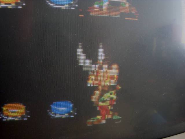 ..and surrounded by sparklies i.e. pixels that flick on and off. Mask rom faults usually put vertical lines through the sprites so I thought it might be something more serious. I am always concerned that faults on these boards are related to the custom ICs, impossible to debug, only option is to replace them, which as they are surface mount and are only available on other boards means I tend to write the board off.
