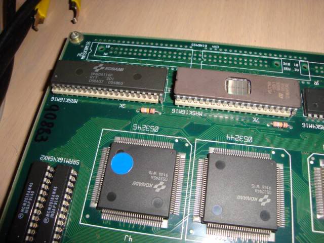 Logic would suggest that it was the newly installed 27C160 causing the issue, but even when the original masks were back on board it did the same. The reset line to the 68000 would flick at the point of reset and this is driven from a Konami 051550 custom 24 pin SIP chip , it had been badly bent to one side and someone had reflowed solder where it joined the PCB on the parts side. The solderside was untouched so I thought that it have actually been snapped off and reattached.
