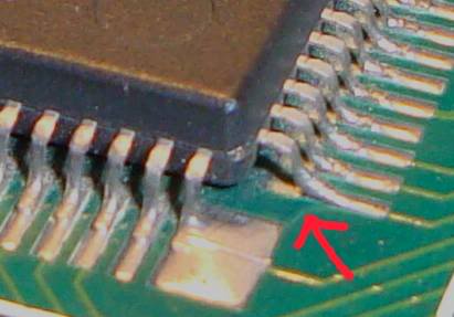 The solder had wicked up the leg and looked rather crystaline instead of the nice matt grey on all the other pins. The leg also was not quite down onto the board as far as the other legs, perhaps half a millimetre raised. To the naked eye it was virtually invisible but with a magifier it looked like the solder might have coated the leg like a sleeve forming a dry joint.