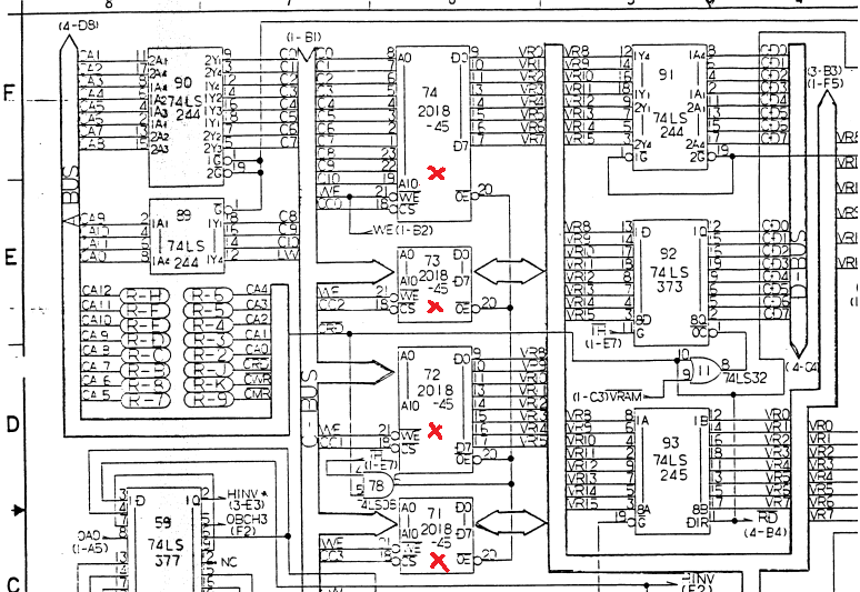 When RAM chips are paired there needs to be a mechanism to ensure that only one of the pair can drive the data lines at a time, otherwise their outputs fight each other and the data is totally corrupted. There are two ways to silence a 2018 chip, one is to use the /OE (output enable) pin, when this is logic high the outputs of the chip are isolated from the bus. The other method is to deselect the chip entirely with the chip select pin /CS. This is a slower method then using /OE but puts the chip in a low power mode, often this is simply tied to ground and the control uses the /OE pins alone. On this board both /OE and and /CS are employed and on each of the pairs only one of the /CS pins had any activity, the other was held low which means those chips would always be fighting their partner chips to drive the data lines. The /OE lines are common and therefore cannot be used to control these chips individually on this board, so there was a fault upstream of 2 out of the 4 /OE pins, which according to the schematics are lines called C00, C02, C01 and C03 on the "C-BUS".