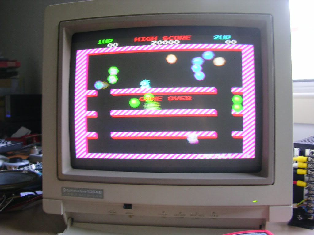 I have had Stu's original Taito Bubble Bobble PCB in my toy room for ages and finally got an afternoon to myself to take a look at it. The fault was that it would run blind, giving only a white screen. Firing this up on the repair bench with the harness from my board gave this, sound effects but not much else.