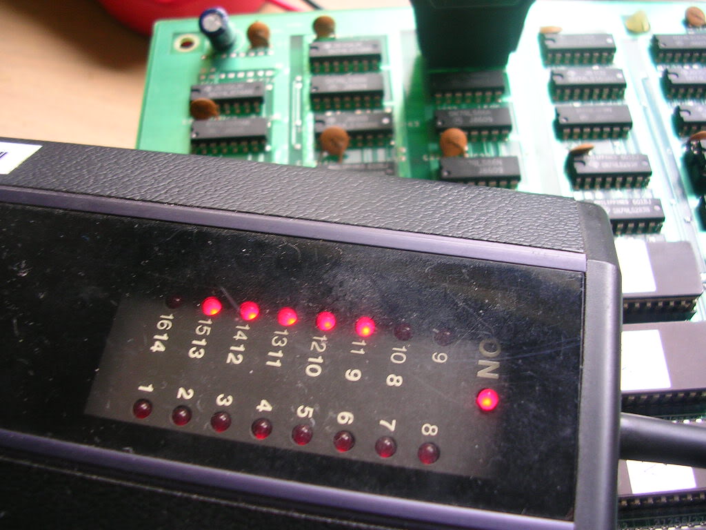 ...the outputs were active on the scope but looked faint and somewhat unstable. These are not common chips and had to go through my entire scrap pile until I reached the a board at the very bottom that had one I could scavenge. A quick de-solder and test on the ERPOM reader to confirm it was ok and it ended up in the logic comparator as the known good chip. When the board was powered up with the clip attached to IC20 I got this...
