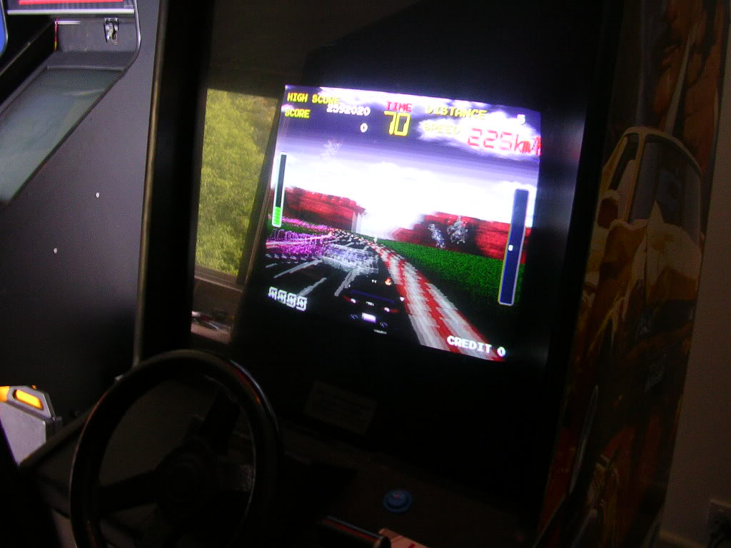 Even though I had no monitor connected I could tell from the scope that this had changed something. What I was expecting to see was both chips light up on the data bus and to see the whole board busily active. What I got was peace and quite, both object RAM chips were doing nothing, but the board was no longer resetting. Puzzled I put it back into the cabinet so I could see the output, when powered on I was greeted with the diagnostic menu asking me to use the steering wheel to select either steering or PCB diagnostics. This explained why the object RAM was doing nothing, it was a static text screen wait for an input I could not give it outside of the cabinet.