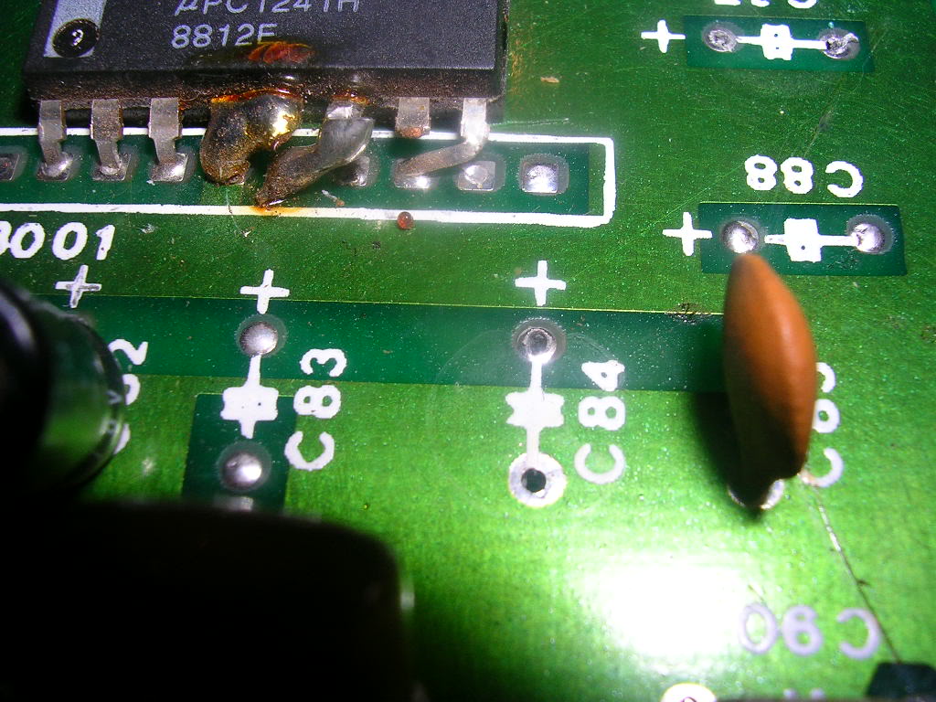What is odd is that the board was designed and silk-screened for a 13001 amp chip, yet it has an NEC 1241H on board, odder still is that this amp chip is the original one on the board. The soldering is clearly original and the other holes were never used. This might explain why there are so many missing components in the amp section, support components for the other amp chip type. However, unused holes would have been filled by solder when the board was flow soldered, so the gaping holes at c84 and c87 were where parts used to be parts that had been torn off.