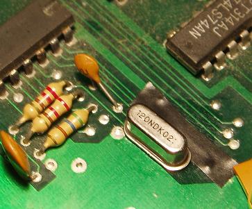 Everything else on the board looked OK, but couldn't see a crystal anywhere on the board. Looked up on the net the MAME source code for Commando which showed it required a 12 MHz crystal. I couldn't find a 12 MHz crystal on any of my scrap boards but searching through my junk (I have plenty of that) I found an old 40 megabyte PC hard drive with a newer style crystal that was 12 MHz. Fitted it to the board with a bit of tape under it to keep it off the neighbouring vias.