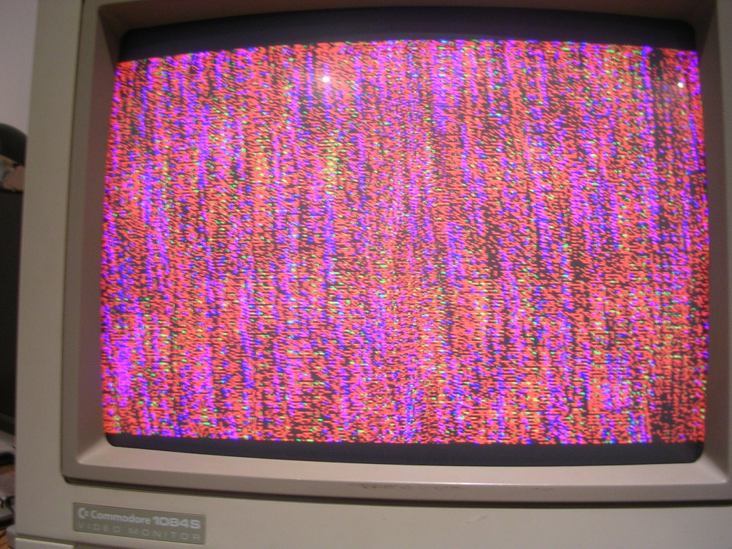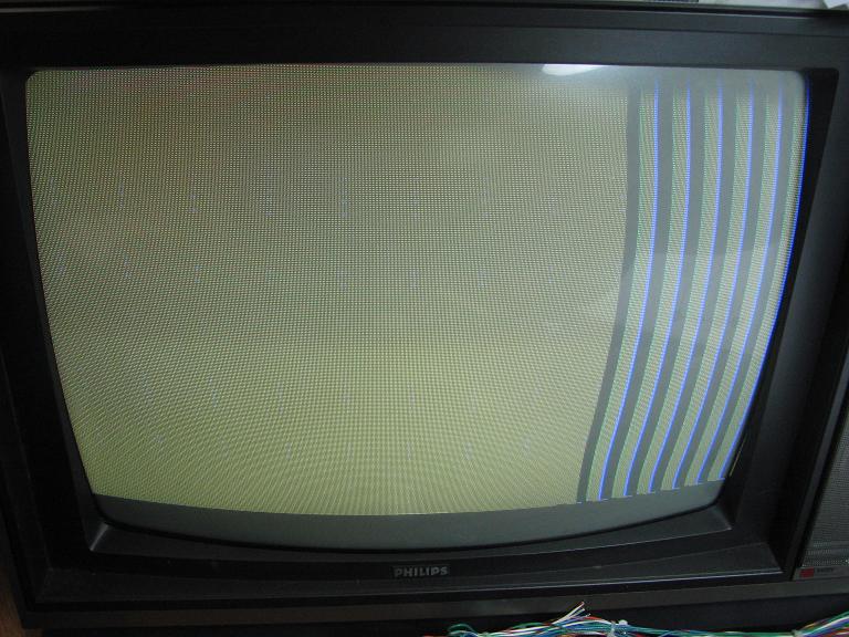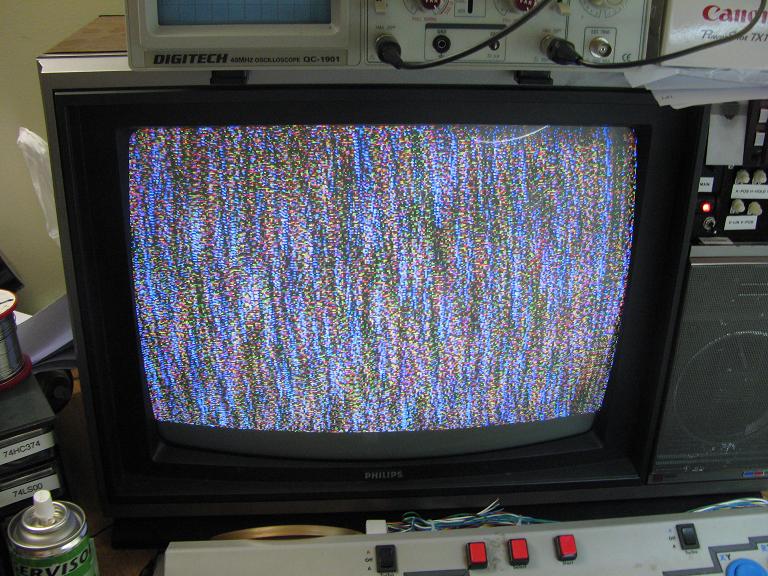 OK first thing on the list was a full inspection, Jumpy had already informed me of a bad ram socket that he had replaced and I also noticed a pin missing on the 40pin connector for the ROM board, apart from that it looked reasonable. Connect it all up and the screen was not exactly what I wanted to see, static vertical lines.