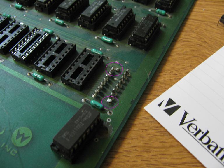 There was also signs of an old bodge on the CMOS RAM socket where a track had been damaged and blob-soldered to a track on the upper side of the board that I wanted to tidy up. So these were removed, and machined pin sockets installed. These are the best sockets you can use for chips but they have a couple of disadvantages over dual wipes, firstly cost, secondly the shoulder of the pin means its hard to get them back off a board if the board turns out to be scrap, and thirdly it is much harder to get a Fluke pod to connect to a machined pin CPU socket, which is why the 6809e didn't get one.