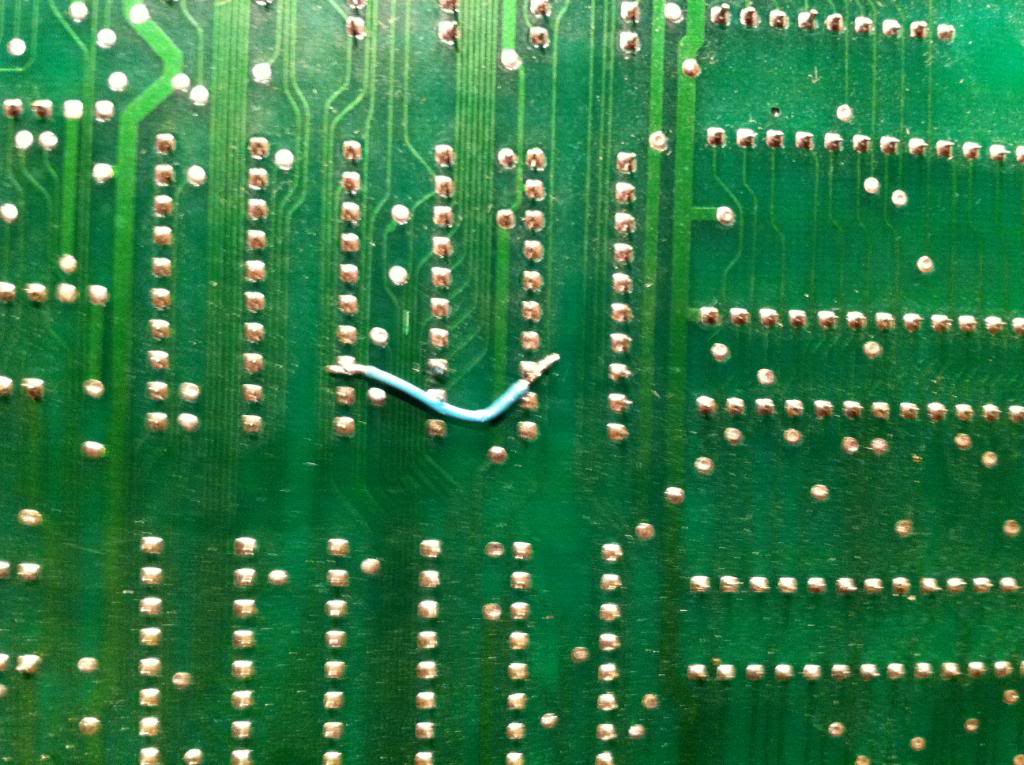 (At this point, my hands were shakey and my palms moist, had I found my first REAL arcade hardware bug?) By beeping, I found, that all the remaining inputs were tied to a an in-/output on the 245 just next to it at M8. Only one was not (the plot thickens, MUAHAHAHA!). Tried to connect the two pins by just poking a piece of wire at both, and viola: All sprites back to normal!