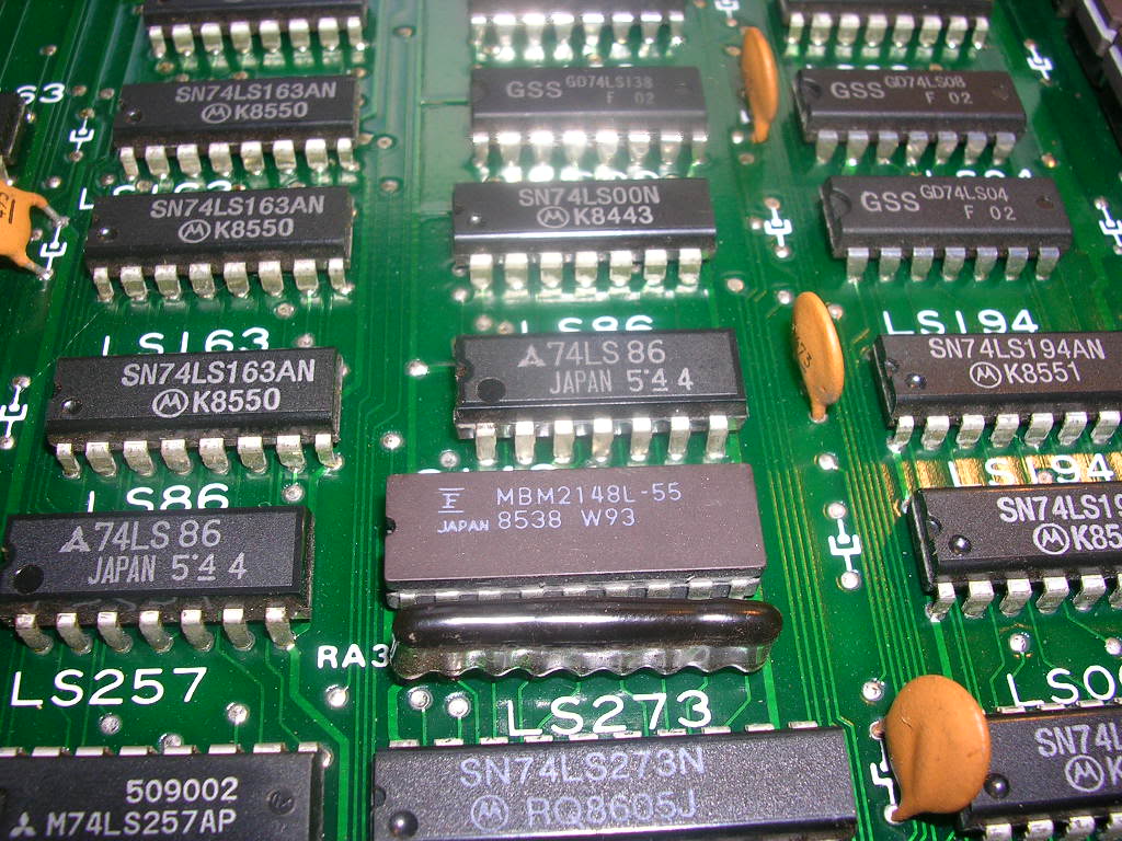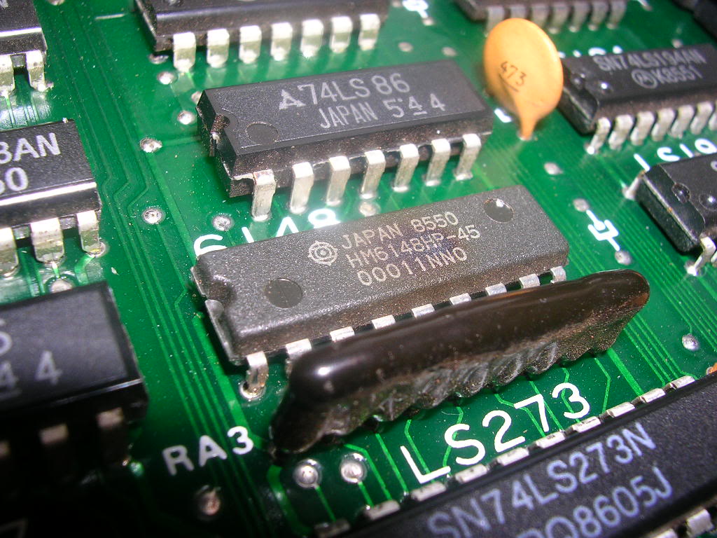 The sprites are generated on the lower video board and the most likely suspect as there were no Fujitsu TTLs was the SRAM. I probably would advise people to dump the ROMs first but all ROMs on this board were EPROMs which tend to be far more resilient than and mask ROMs and I couldn't be bothered . Someone had already replaced one of the 4 2148 SRAMs on the board but even the originals were a mish-mash of types...