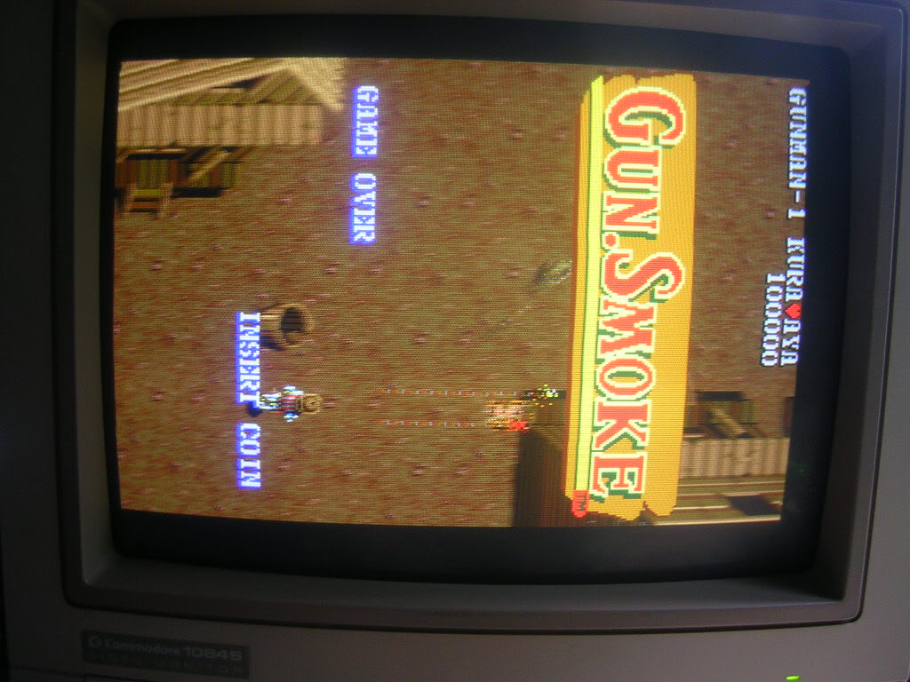 I replaced the crystal 12MHz at K1 (as its marked on my board) on the top board and fired it up. The display was pretty much garbage but I could just make out the wanted posters, which confirmed it was GunSmoke and it was running.