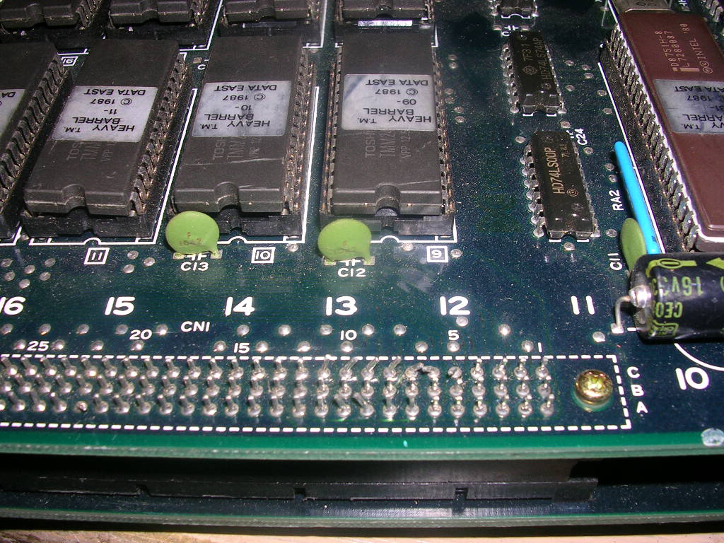 Clearly the vast majority of the board is in perfect working order as the game code runs, the display is solid, the colours are right, everything moves around as it should and the sound works. The only thing was the sprite blocks were wrong. Having narrowed it down like that it still leaves a tonne of options for the underlying fault. It could be bad ROMs, could be bad RAM, could be bad logic, it could even be bad custom chips, or it could be that someone at some stage knocked the board and bent two pins on the board interconnect together.