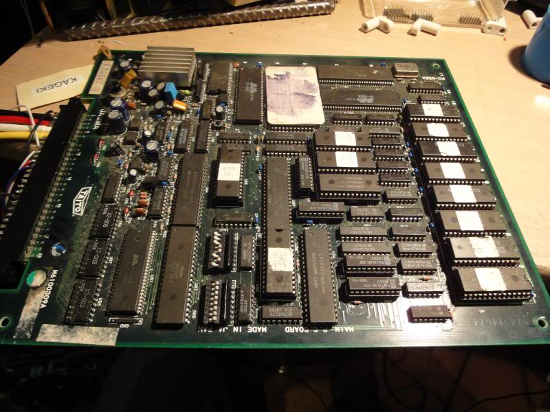 Had a few more of Left_jump_left_1P's boards in lately, the ones that had been stored somewhere damp, the first two I looked at were just rotten, corrosion everywhere, wrecked customs, wrecked PCB tracks, totally beyond repair. The third out of the pile was Kageki, a weird-arse Japanese fighting game from Taito