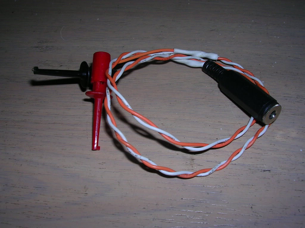...the two micro clips hook up to the amp ground pin and the audio input pin which lets me squirt the audio into the line input on my PC speakers.