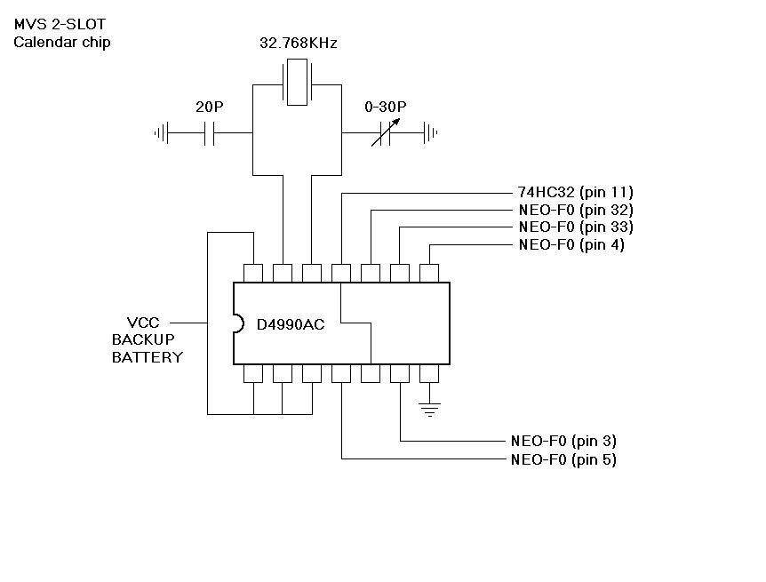 .. what is called "stuck on green". A healthy Neo Geo board will also display this green screen, but should then boot to a cross-hatch screen when it does not find a game cartridge. This never got past the green screen, which some reading around showed was basically another form of calendar error anyway. The most common cause of this is, on most Neo Geo boards, battery damage cutting the power to the NEC D4990 clock chip. This board had no battery damage and it the NEC chip had its 5V supply intact. The second most common failure is the 32.768MHz crystal, except on this board the crystal was happily wagging away. So again the the most likely cause was track rot. More googling threw up this superbly useful schematic (author unknown) of how the D4990 connects up on a 2 slot NG board...