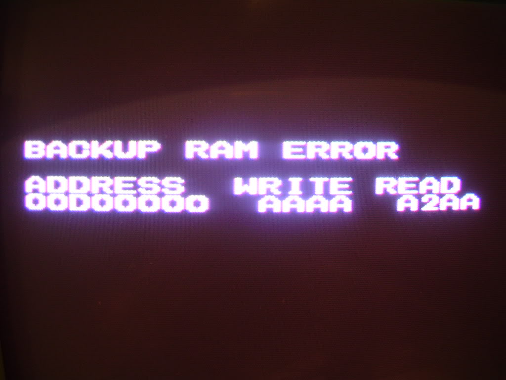 The first thing to do with these hex errors is translate them to binary, what the error means is that the board tried to test the backup RAM by writing a pattern to it, then reading it back and comparing what it sent to what it received.