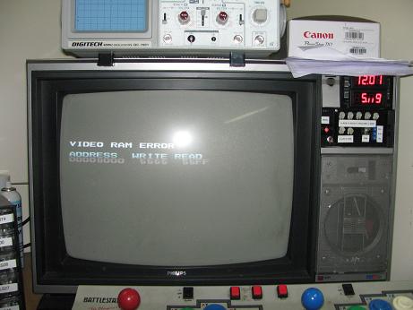 After replacing all broken parts I then powered up the game board... It goes past the test but there is small defects in the graphics... ahh crap more work... I suspect corroded tracks as the graphics data passes through buffers near the slightly leaked battery.