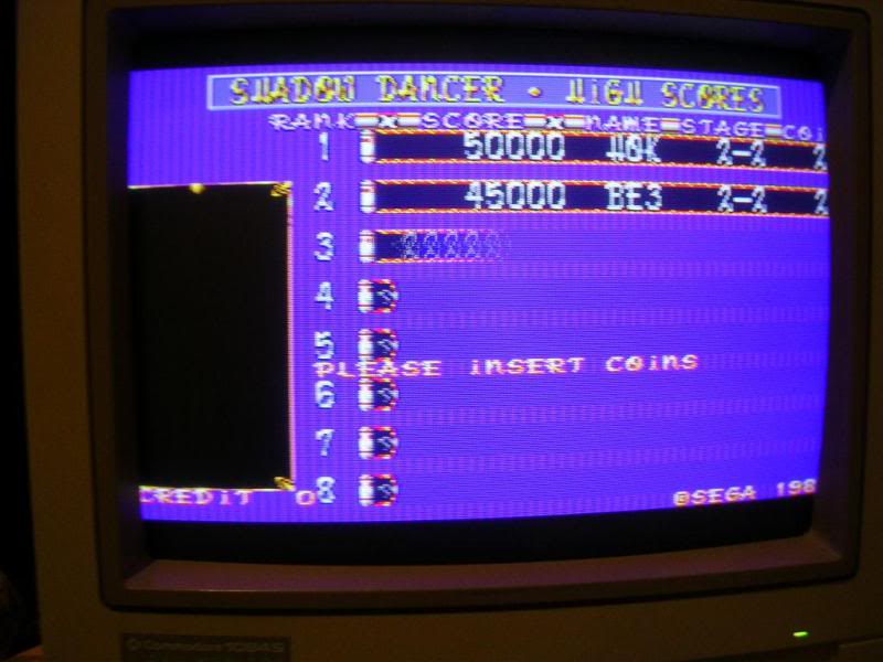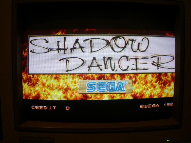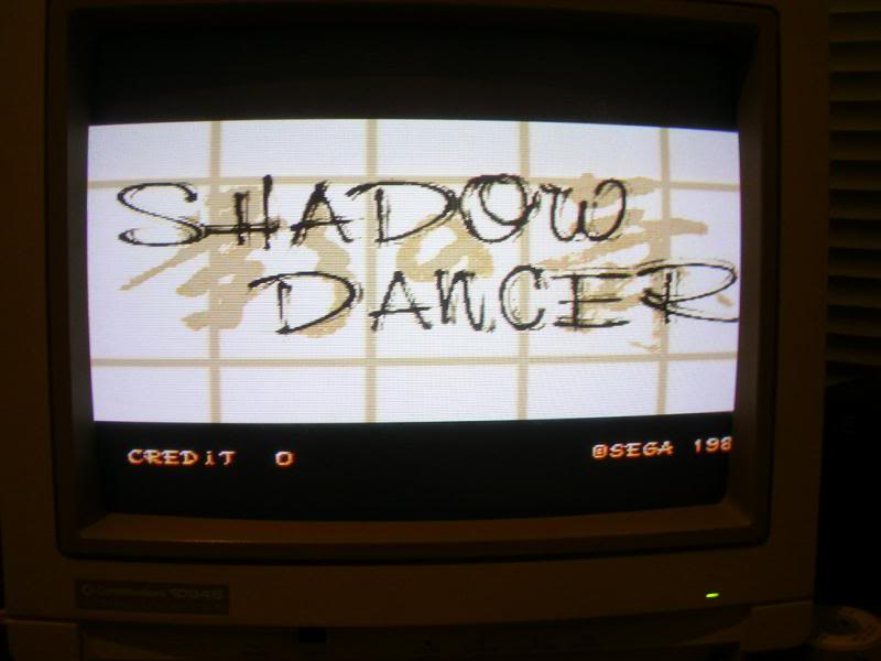 Shadow Dancers is on a System 18 board and I have a single System 18 board in my collection - Moonwalker, which happens to have a very good RAM/ROM test built in, i.e. it takes ages to test a chip before pronouncing a pass or a fail. So I swapped in the Moonwalker ROM board, the protection chip and fired it up. It had a very similar set of faults, the moonwalking feet were half missing, and in the game the sprites were mostly missing, but some were present but badly corrupted, basically same fault, different game.