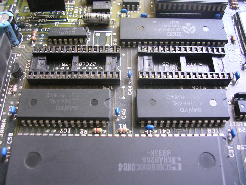 ... this sawtooth pattern is not what healthy logic transitions should look like and can be a sign of bus contention, ie more than one device trying to talk on the bus at the same time. On the main CPU data bus there will be the CPU itself, some RAM, some ROM and buffers all of which have to be controlled so that when one device has control of the bus, all other devices stay silent for the alloted period of time. Its possible that one of the RAMs, or ROMs had died in a way that it was no longer able to shut up, but as all 16 data pins across the bus where showing this pattern it would take two identical faults on either both RAMs, both ROMs, or a single fault on the CPU itself, all fairly unlikely, the most likely was the output enable system was not working correctly and the /OE pins on the devices were not being controlled. So I pulled both system ROMs from their sockets...