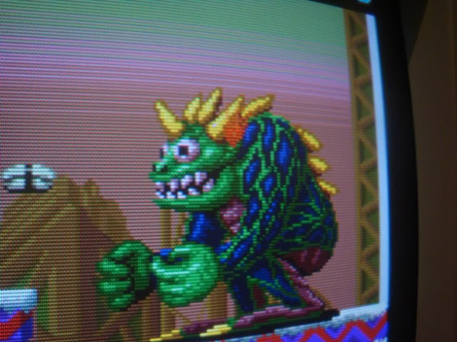 The upper sections of the background in the above photo are corrupted, some of the text was still flikering madly and on the title screen there was a block of grey where there shouldn't be anything.