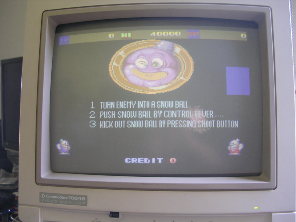 Having worked on Snow Bros boards before I have seen this fault multiple times and it has always been the same problem, a bad 41464 DRAM chip in what I assume is the palette RAM section of the board.