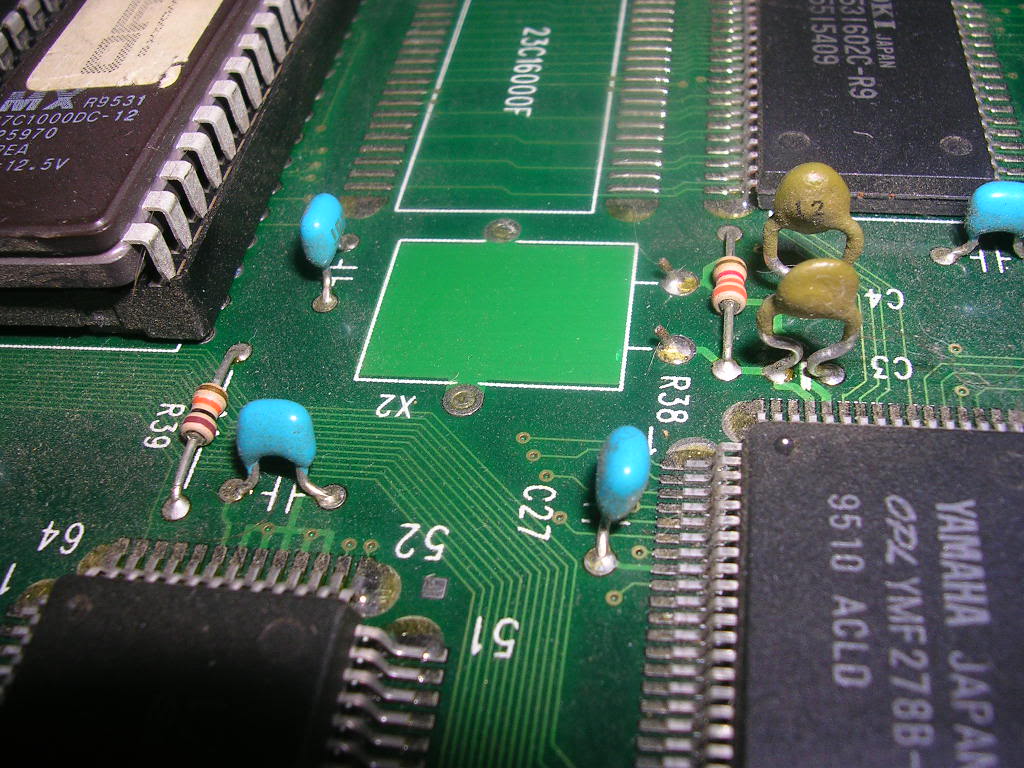 Finding out what frequency the crystal should have been was the next issue, the silkscreening on the board didn’t say and according to MAME there are three variants of this board, all with different audio sections. This board is the one with a Yamaha YMF278B which apparently should be driven at 33.8688Mhz, however on PCBs the speed a chip is driven often doesn’t exactly translate to the frequency of the clock crystal. This is because the signal from the crystal is not exactly clean, so it gets fed into some logic to divide it down, the end result is a far cleaner signal than you would get if you had a crystal of the exact speed. In this case the crystal connects straight between two pins on the YMF278B, the YMF datasheet showed it needed this exact speed which is divided down internally to the common audio frequencies.