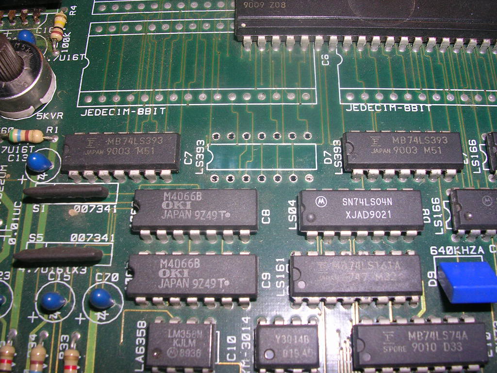 ....which is the big chip in the above shot, the fault could be due to a failed MASK at this location, (the test routines didn't even attempt to test this one) but a quick check with the scope showed the address bus was doing absolutely nothing. This ROM is somewhat unique on the board in that it is addressed by a chain of 4-Bit Binary counters spread over 3 74LS393 chips at B7, C7 and D7. When working correctly these allow the board to scroll through the full address space on that chip with a single activation signal, the CPU has no involvment in playing the sample as the counters basically empty its contents directly into the sound system for decoding and DAC'ing.