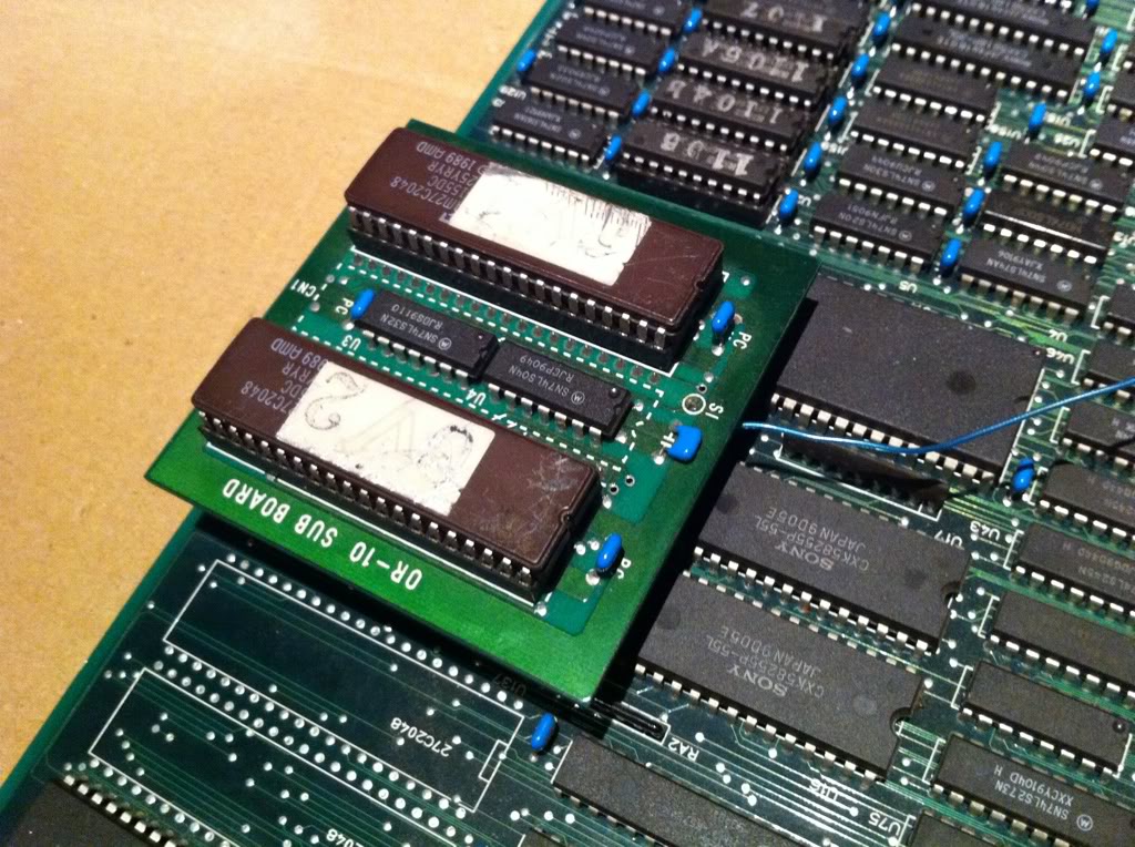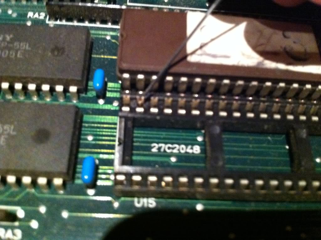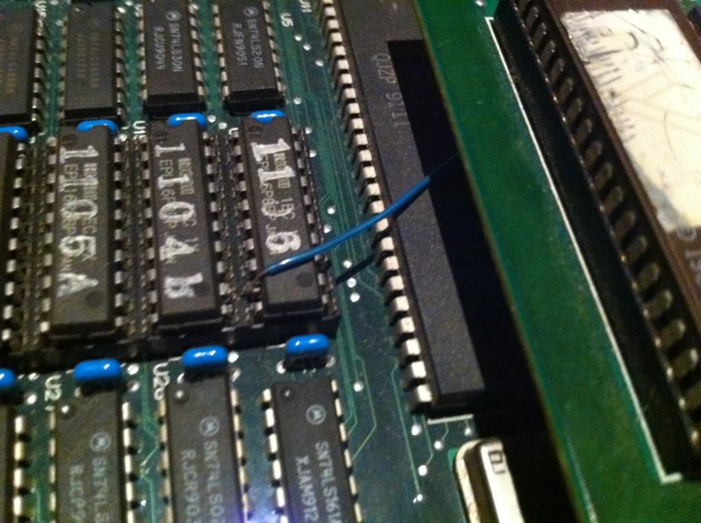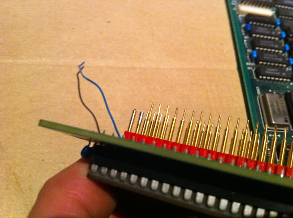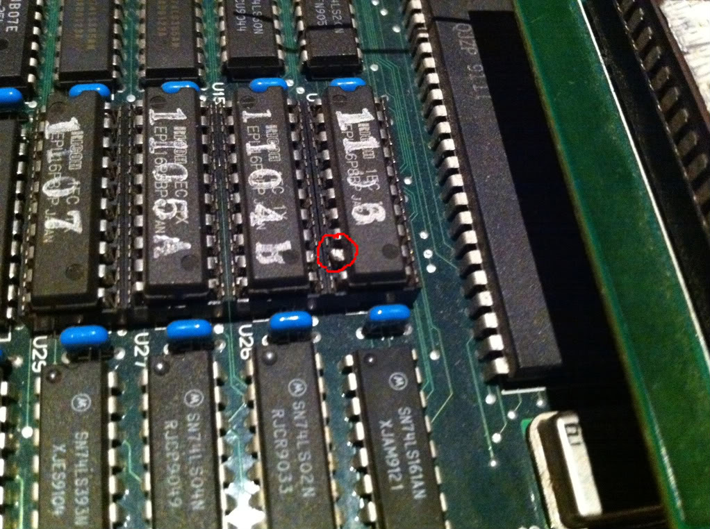 Now I had to deal with the loose wire. Putting the sub board back in place, the lenght of the wire gave my an obvious radius on the board to investigate. I quickly found a pin on a socketed IC with a blob of solder on it