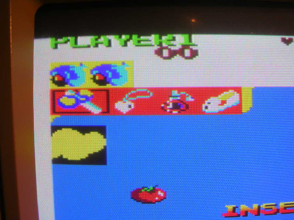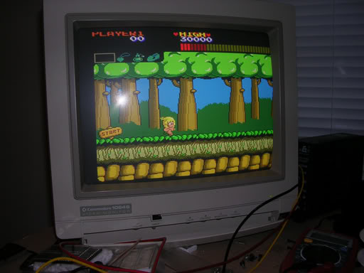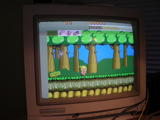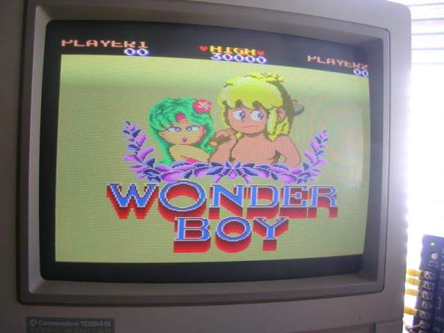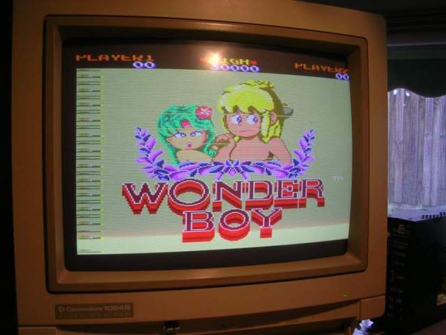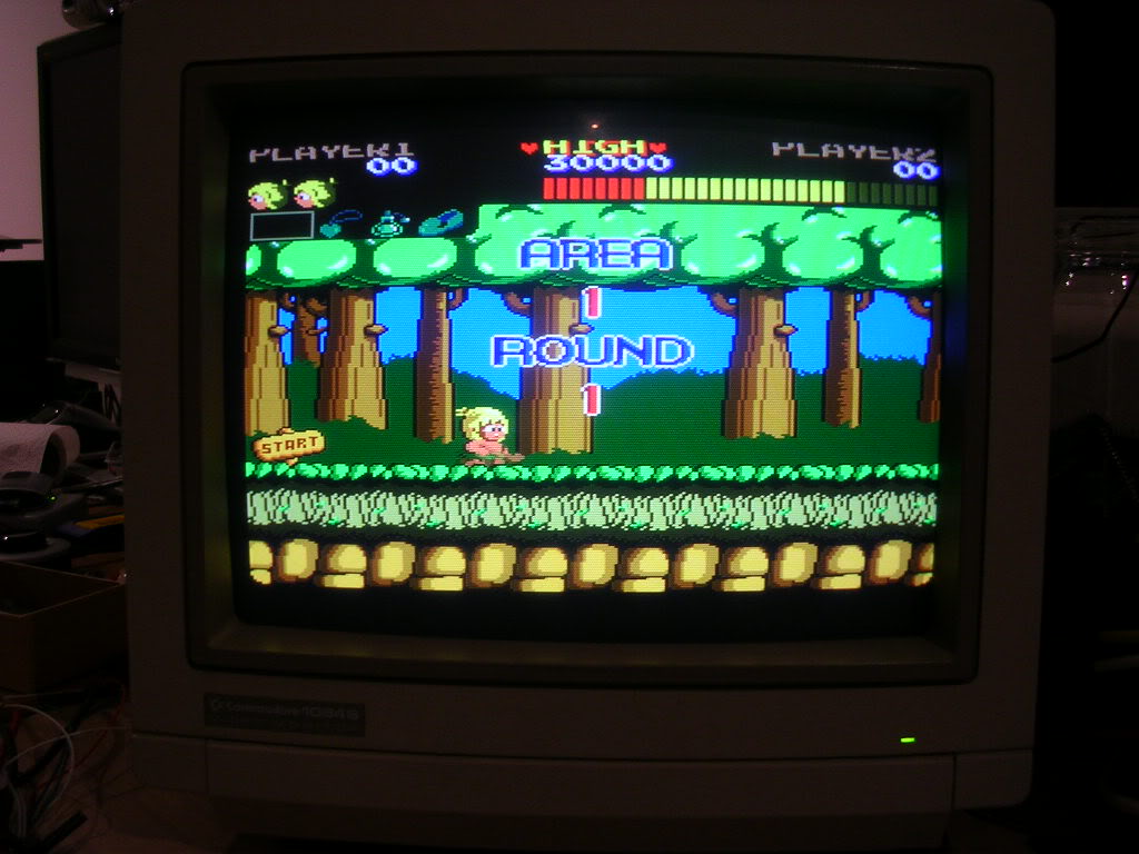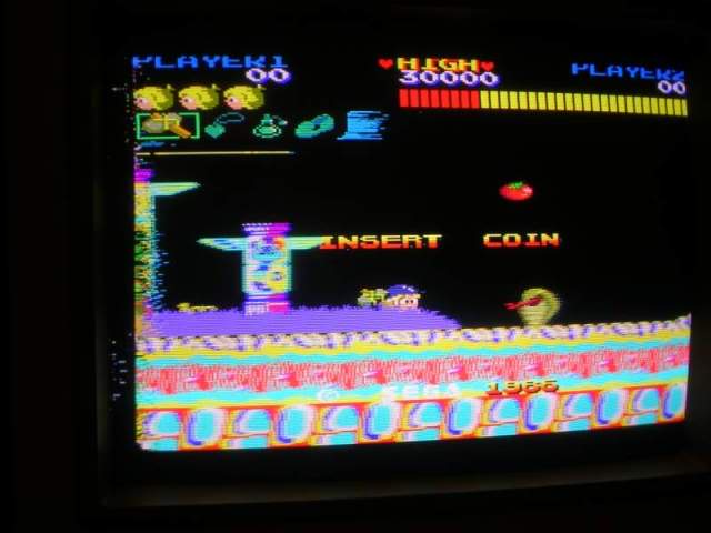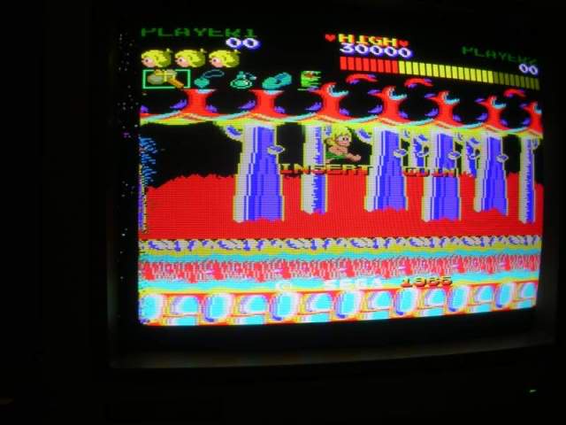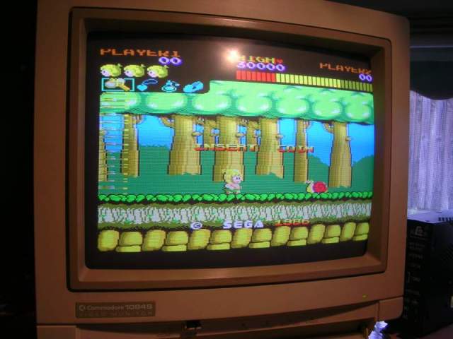 The Wonderboy sprite was also a bit unstable, sometimes the "walking" sprite was torn up and only came good when he jumped or was on his skateboard. Probably the oddest issue was that the Wonderboy sprite was actually behind the background and was only visible when he jumped above the line of the red bushes or got out of the forest.
