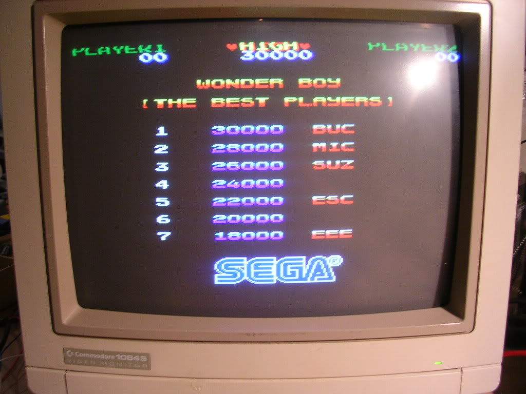Luckily there is a decrypted version available for this board layout, Wonderboy came in a couple of variations in terms of ROM layout and the romset "wboyu" had the right layout for this board and only needed a few ROMs to be reprogrammed. As soon as this was done the board leapt into life, by the way the Z80 that had "BAD" written on it works perfectly so I don't know what that was about, perhaps a previous owner got the board after the CPU had been pinched, and only had one Z80 to test, thereby coming to the conclusion it was duff as it did nothing on the board. The death of the Mitsubishi EPROMs was probably the original fault, hence the masking tape message, and the CPU got pinched as a spare.