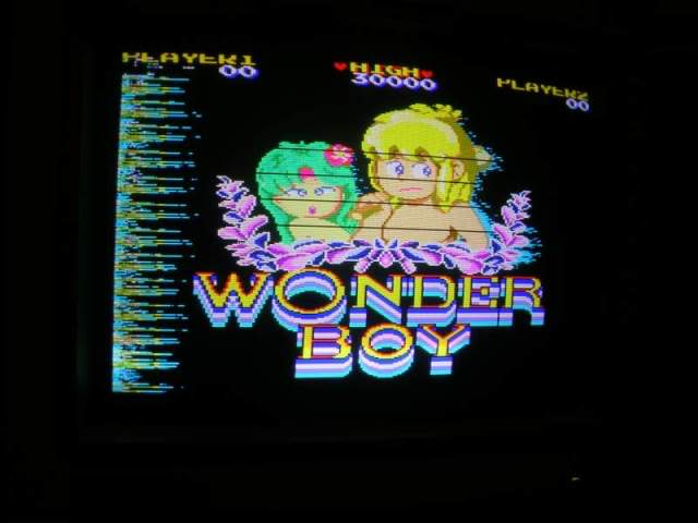 Symptom: Sprites problem – for example, on the title screen with Wonder Boy and Tina, Tina is a smeared, horizontally stretched mass of pixels, and some in-game sprites are similarly smeared. (original Sega board with daughterboards) Cure: Bad LS245 at location IC108 – replaced