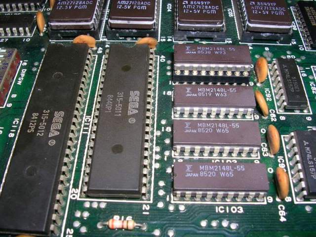 Symptom: Background partly garbled, no black areas where they should be at the top of the screen and other faults (original Sega board with daughterboards) Cure: Bad 6116 RAM at location IC102 - replaced
