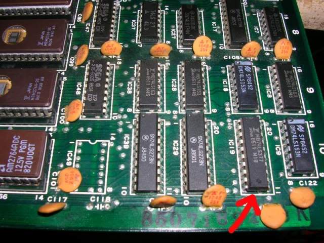 Symptom: Most colours non-existent, all that’s displayed are shades of a yellowy-green and an off white for the text (original Sega board with daughterboards) Cure: Bad LS245 at location IC150