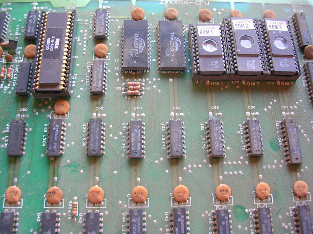 Stu very kindly donated me a faulty Zaxxon board recently and even dropped it round for me, as it was an original and a classic I took pity on it. I had googled what the board was and had found the schematics but what arrived was not what I was expecting. All the doco and almost all the photos show a dual PCB stack, what I had was this...