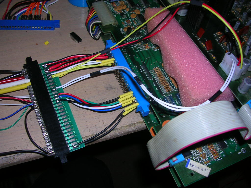 As this board is not the one mentioned in all the documentation I was pretty cautious to confirm if the pinouts were going to match. The 5v and ground lines are easy to track down as any 74 series TTL chip on the board will give you a known pin for each and you can buzz it back to the edge connector easily enough. What was less easy to confirm was the -5v and the 12v rails shown on the pinouts. Normally the 12v line is solely used by the amp chip, but it was clear there was no connectivity between the audio board and the lower two main boards on any of the voltage lines so there was no connectivity from the edge connector to the amp chip, but the 12v line was still plumbed in. The two main boards have a linker cable between then that carries the 5V, ground and what should be the -5v and the 12v from the CPU board (the one with the edge connector) to the lower video board. Digging through the schematics for the later revision of the board I could see that 12V was required by the video generation circuit which uses it to derive a 6v feed for some analogue sections of the board, and much the same for the -5V so I was pretty confident the pinout was correct, at least for the power lines. As for the video out it didn't really matter if I got that wrong as the only result would be a lack of video, rather than a smoking wreck if I had got the power lines wrong.